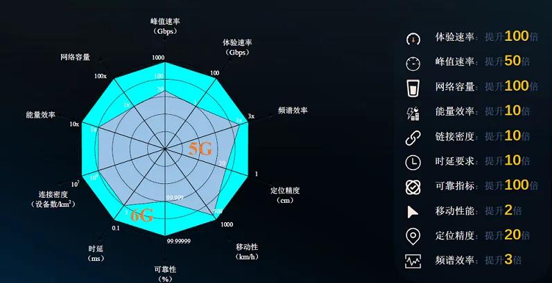 5G作為4G的延伸,也具有明顯的高速率,低時(shí)延、大容量等特征,例如:傳輸速度可達(dá)20Gbps;時(shí)延低至1ms;5G室內(nèi)定位精度3.5GHz頻段下在5m左右,毫米波定位精度可以達(dá)到3m……但6G與之相較,優(yōu)勢(shì)更為突出。